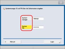 Der Systemmanager und der SSO-H Systemadministrator (Administrator) können sämtliche Einstellungen des Systems vornehmen. Nähere Informationen zu diesen unterschiedlichen Arten von Administratoren finden Sie im Abschnitt "Administratoreinstellungen". Ein Systemmanager ist werkseitig auf dem System eingerichtet (ID Systemmanager/System PIN). Daher müssen sich Administratoren durch die Eingabe dieser Systemmanager-ID und System-PIN einloggen. Die werkseitige Grundeinstellung für Systemmanager-ID und System-PIN lautet '7654321'. Es empfiehlt sich, sowohl die Systemmanager-ID als auch die System-PIN zu ändern. Nähere Informationen zum Einrichten der Systemmanager-ID und System-PIN finden Sie im Abschnitt "Definieren von Einstellungen zur Systemverwaltung". Nähere Informationen zu Elementen, die Sie als Administrator unter Einstellungen/Speicherung einrichten können, finden Sie in den Abschnitten "Administratorberechtigungen für Einstellungen (Sensordisplay)" und "Tabelle: Verfügbare Administrator-Einstellungen (Remote UI)".