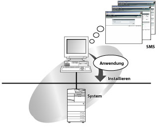 SMS (Service Management System) ist eine Software, mit deren Hilfe Sie mit einem Webbrowser in einem Netzwerk auf Color imageRUNNER-/imageRUNNER-, imagePRESS- oder imageRUNNER ADVANCE-Systeme (im Folgenden als "System" bezeichnet) zugreifen sowie MEAP-Anwendungen installieren und verwalten können. Die zur Verwendung von SMS benötigte Software (Webserversoftware) ist in dieser Software enthalten. Damit Sie mit SMS arbeiten können, benötigen Sie lediglich einen Webbrowser und eine Netzwerkverbindung zwischen Ihrem Computer und dem System. Sie können SMS verwenden, wenn das System an das gleiche Netzwerk angeschlossen ist wie Ihr Computer. Mit SMS stehen Ihnen folgende Möglichkeiten zur Verfügung: