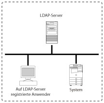 Anwender, die im LDAP-Server gespeichert/verwaltet werden oder im System gespeichert sind, können authentisiert werden. Der Anwender wählt die Orte zum Einloggen (den Servernamen des LDAP-Servers oder [Dies System]) beim Einloggen.