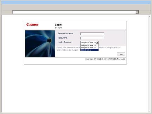 Die Namen der Domains oder die Servernamen der LDAP-Server, die die Anwenderauthentisierung zulassen, werden in der Auswahlliste für Login-Empfänger alphabetisch angezeigt. Unabhängig von den in der Auswahlliste mit den Login Adressen angezeigten Einträgen steht die Domain, zu der das System selbst gehört, immer am Anfang der Liste. Am Ende der Liste wird [Dies System] angezeigt.
