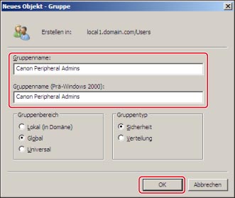 Geben Sie im Dialogfeld [Neues Objekt - Gruppe] den Gruppennamen ('Canon Peripheral Admins') ein → Klicken Sie auf [OK].