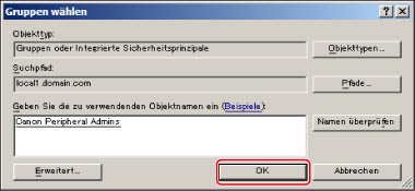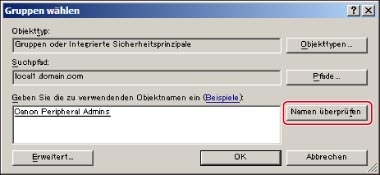 Geben Sie in das Dialogfeld zur Gruppenauswahl 'Canon Peripheral Admins' ein → Klicken Sie auf [Namen überprüfen].