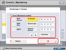 Wenn Sie das System neu starten, nachdem Sie die Einstellungen für DHCP, BOOTP oder RARP festgelegt haben, werden auf dem Display <Einstellungen TCP/IP> für die IP-Adresse die Werte angezeigt, die vom DHCP-, BOOTP- oder RARP-Server stammen. (Wenn Sie bereits vorher eine IP-Adresse, einen Hostnamen oder einen Domännamen festgelegt hatten, werden diese Angaben durch die Werte überschrieben, die von DHCP, BOOTP oder RARP kommen.)