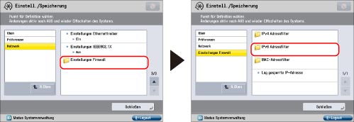 Berühren Sie [Einstellungen Firewall] für [Netzwerk] → [IPv6-Adressfilter].
