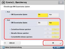 Berühren Sie [Einstellungen DNS Dynamisches Update] für [Einstellungen DNS] → Legen Sie die folgenden Elemente in <IPv6> fest → Berühren Sie [OK].