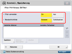 Bei [EM Filter] können Sie eine Ausnahme-Portnummer ebenso wie die IPv6-Adresse wählen, so dass Sie einstellen können, welche Computer spezifische Funktionen verwenden können und welche abgewiesen werden. Sie können zum Beispiel mehrere Anwendern erlauben, über Druckserver zu drucken und ihnen den Zugriff auf Remote UI verweigern, während Administratoren alle diese Funktionen verwenden dürfen.