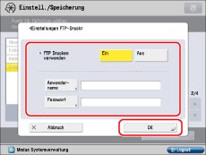 Berühren Sie [Ein] für <FTP Drucken verwenden>, um FTP als Druckanwendung zu verwenden.