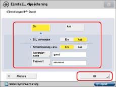 Wenn Sie die IPP-Authentisierungsfunktion verwenden möchten, berühren Sie [Ein] für <Authentisierung verw.>. Berühren Sie [Anwendername] → Geben Sie den Anwendernamen für die IPP-Authentisierung ein → Berühren Sie [OK]. Berühren Sie [Passwort] → Geben Sie das Passwort für die IPP-Authentisierung ein → Berühren Sie [OK]. Geben Sie zur Bestätigung dasselbe Passwort ein → Gerühren Sie [OK].