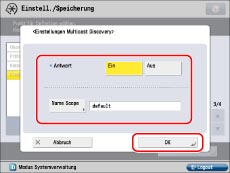Berühren Sie [Ein] für <Antwort>, um Geräteinformationen von anderen Systemen zu verwenden, wie z. B. ein Adressbuch oder Einstellungen zur Verwaltung per Abteilungs ID, oder auf ein Multicast-Discovery mit Werkzeugen antworten.