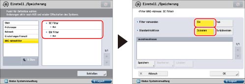 Berühren Sie [SE Filter] oder [EM Filter] für [Filter MAC-Adresse] → [Ein] für <Filter verwenden> → [Zulassen] für <Standardrichtlinie>.