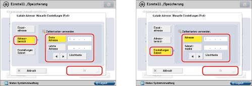 So legen Sie einen Bereich von IPv4-Adressen fest: Berühren Sie [Adressbereich] → Berühren Sie [Erste Adresse] → Geben Sie die erste IPv4-Adresse ein → Berühren Sie [Letzte Adresse] → Geben Sie die letzte IPv4-Adresse ein.