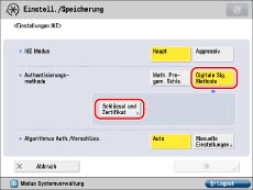 Berühren Sie [Digitale Sig. Methode] für <Authentisierungsmethode> → [Schlüssel und Zertifikat].