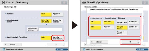 Berühren Sie [Manuelle Einstellungen] für <Algorithmus Auth./Verschlüss.> → Legen Sie den Algorithmus für die Authentisierungsmethode fest → Berühren Sie [OK].