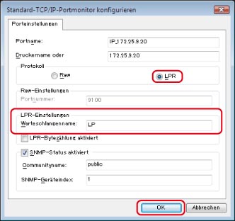 Wählen Sie [LPR] in [Protokoll] aus → Geben Sie den Druckwarteschlangennamen in [Warteschlangenname] in [LPR-Einstellungen] ein → Klicken Sie auf [OK].