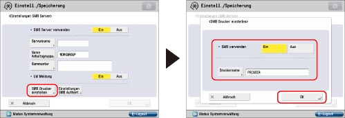 Berühren Sie [SMB-Drucker einstellen] → Legen Sie die SMB-Druckereinstellungen fest → Berühren Sie [OK].