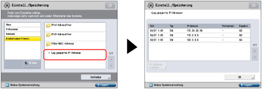Wenn IP-Adressen so festgelegt worden sind, dass Datenübertragung und -empfang mit dem System abgelehnt werden, und ein Versuch zur Datenübertragung und -empfang zwischen dem System und Einheiten mit diesen IP-Adressen unternommen wird, wird ein Sperrungslog aufgezeichnet. Außerdem wird bei der Datenübertragung ein Sperrungslog für IP-Adressen und Portnummern aufgezeichnet.