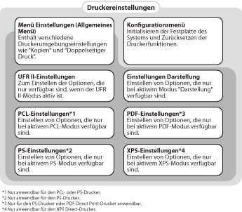 Folgende Menüs gehören zum Menü <Einstellungen Drucker>.
