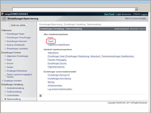 Während der Aktion <Alles exportieren> kann das Remote UI nicht für die folgenden Aktionen ausführen (<Status Monitor/Abbruch>, <Einstell./Speicherung>, <Zugang zu empfangenen/gespeicherten Dateien>, <Adressbuch>, <Direktdruck>).