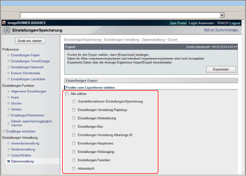 Sie können die letzten Import/Export-Ergebnisse auch prüfen, indem Sie [Datenverwaltung] für <Einstellungen Verwaltung> berühren → [Ergebnisse Import/Export].