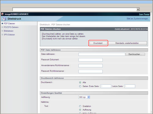 Wenn Sie eine PDF-Datei durch Eingabe ihrer URL drucken, kann der folgende Druckauftrag erst beginnen, nachdem die PDF-Datei heruntergeladen wurde oder der Browser die Verbindung zum Webserver unterbrochen hat.