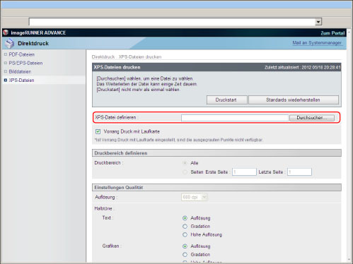 Zum Drucken einer XPS-Datei, ohne sie zu öffnen, ist das Direct Print Kit (für PDF/XPS) erforderlich.