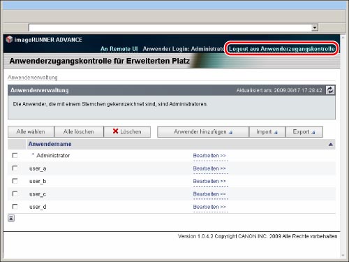 Klicken Sie auf [Logout aus Anwenderzugangskontrolle], um den Vorgang zu beenden. Wenn Sie die Webbrowser-Seite schließen, ohne auf [Logout aus Anwenderzugangskontrolle] zu klicken, wird der Logout-Vorgang nicht korrekt ausgeführt. In diesem Fall können Sie sich etwa 30 Minuten lang nicht mehr einloggen.