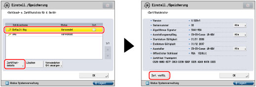 Wenn [Zert. verifiz.] gedimmt dargestellt oder <Schlüssel beschädigt o. ungültig.> angezeigt wird, können Sie dieses Schlüsselpaar nicht verwenden. Gehen Sie gemäß der Verfahrensbeschreibung in