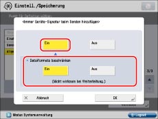 Berühren Sie nacheinander die Tasten [Immer Geräte-Signatur beim Senden hinzufg.] → [Ein] für <Immer Geräte-Signatur beim Senden hinzufg.> → Definieren Sie die Einstellung für <Dateiformate beschränken>.