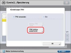 Wenn die Initialisierung anhand der Schritte für "Initialisieren aller Daten/Einstellungen", durchgeführt wird, werden alle mit dem TPM-Schlüssel verschlüsselten Daten vollständig gelöscht und der TPM-Modus wird inaktiv.