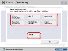 Wenn Sie [Wert in Einst./Spch.] und [Adressbuch] nicht gleichzeitig wiederherstellen, werden die Einstellungen in [Einstell. URLSend.] für [Fax/I-Fax Eingangsbox einstellen] und [Einstellungen Mailbox] möglicherweise gelöscht.