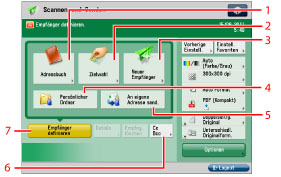 Berühren Sie diese Taste zum Definieren Ihrer eigenen E-Mail-Adresse als Empfänger. Der Administrator kann allgemeine Anwender darauf beschränken, E-mail nur zu ihren Adressen zu schicken. (Vgl. Abschnitt "Begrenzte Empfänger für Senden von E-Mail einstellen".)