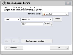 Sie können nicht nach einem Empfänger über einen LDAP-Server suchen, wenn die Zeiteinstellungen von Server und System mehr als fünf Minuten auseinander liegen. Wenn Sie nicht suchen können, obwohl die Angaben zu Anwendername und Passwort stimmen, prüfen Sie die Zeiteinstellungen auf dem Server und dem System.