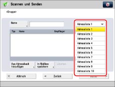 Berühren Sie die Auswahlliste → Wählen Sie ein Adressliste (Adressliste 1 bis 10) aus.