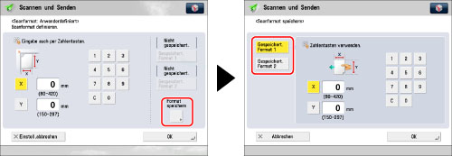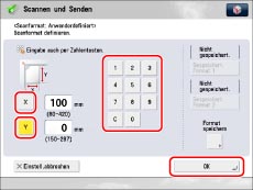 Berühren Sie die Tasten [X] und [Y] → Geben Sie das Scanformat in mm ein → Bestätigen Sie durch Berühren der Taste [OK].