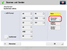 Sie können ein Scanformat manuell eingeben, wenn Sie Originale scannen, deren Format bei der Verwendung der Funktion [Auto Format] nicht erkannt wird. Sie können ein definiertes Scanformat auch speichern.