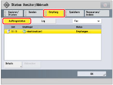Zeigt Detailinformationen zum ausgewählten Auftrag an. Prüfen Sie die Detailinformationen → Berühren Sie die Taste [OK], um zum Display Empfang zurückzukehren.