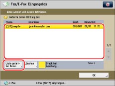 Wenn das System eine umfangreiche I-Fax-Datei empfängt, die vor dem Senden aufgeteilt wurde, werden die Teile in der <Geteilte Daten EM Eingangsbox> gespeichert. Die Daten werden dann automatisch zu einer einzigen I-Fax-Datei kombiniert. Die kombinierte Datei wird dann genauso gedruckt, weitergeleitet oder in der Box Speicherempfang gespeichert wie eine reguläre I-Faxdatei.