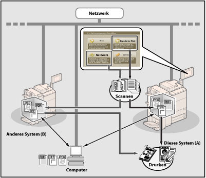 Durch Auswahl des Erweiterten Platzes auf einem anderen imageRUNNER ADVANCE-System über [Netzwerk] können Sie ein Dokument mit diesem System scannen und im Erweiterten Platz eines anderen imageRUNNER ADVANCE-Systems speichern. Sie können dieses System auch verwenden, um Dateien auszudrucken, die auf einem anderen imageRUNNER ADVANCE-System im Netzwerk gespeichert sind.