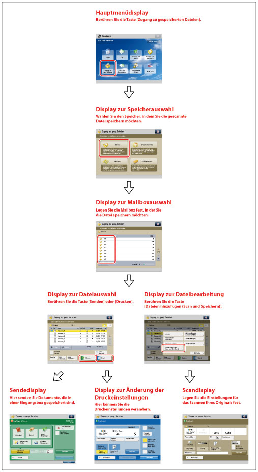 Nähere Informationen zu den Schritten in Bezug auf [Dateien hinzufügen (Scan und Speichern)] und zum Bedienen des Scandisplays finden Sie in den Abschnitten "Hinzufügen einer Datei (Scannen und Speichern)" und "Vorgehen beim Scannen und Speichern".