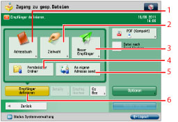 Berühren Sie diese Taste zum Definieren Ihres persönlichen Ordners als Empfänger. Anweisungen zur Einstellung persönlicher Ordner finden Sie unter "Festlegen persönlicher Ordner". Der Administrator kann den Empfänger für Dateiübertragung zu dem persönlichen Ordner des Bedieners beschränken. (Vgl. Abschnitt "Empfänger für Dateiübertragung beschränken".)