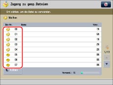 Wenn in der Mailbox zwei oder mehr Dateien gespeichert sind, können Sie sie sortieren, indem Sie [Name] oder [Datum/Zeit] berühren.