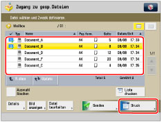 Sie können bis zu 32 Dateien in einer Mailbox gleichzeitig auswählen und drucken. Wenn Sie Dateien zusammenführen, können Sie bis zu 100 Dateien auswählen und drucken. Wenn die Mailbox jedoch reservierte Aufträge enthält, reduziert sich je nach deren Anzahl die Zahl der Dateien, die Sie auswählen und ausdrucken können.