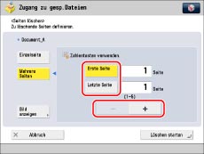 Berühren Sie die Tasten [Erste Seite] und [Letzte Seite] → Geben Sie die erste und die letzte zu löschende Seite mit [-] oder [+] an.