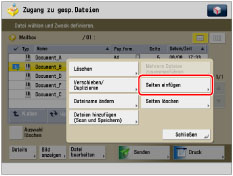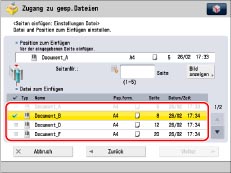 Wenn Sie mehrere Dateien wählen und die Taste [Seiten einfügen] berühren, wird die ausgewählte (markierte) Datei zu der Datei, die eingefügt wird.