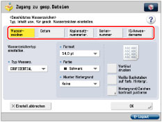 Text, den Sie unter [Anwenderdefin.] eingeben, wird nicht automatisch gespeichert. Wenn Sie das neu erzeugte geschützte Wasserzeichen speichern möchten, um es aufzurufen, wenn Sie es benötigen, berühren Sie die Taste [Speichern] → Geben Sie den zu speichernden Text ein.