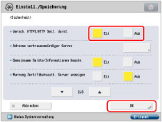 Berühren Sie [Sicherheit] → Wählen Sie [Ein] für <Versch. HTTPS/HTTP Seit. darst.> aus → Berühren Sie [OK].