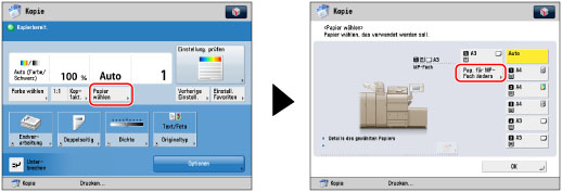 Berühren Sie nacheinander die Tasten [Papier wählen] → [Pap. für MP-Fach ändern].