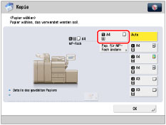 Wenn für den aktuellen Auftrag Papier über das Mehrzweckfach zugeführt wird, können Sie das Papier für den nächsten Auftrag über [Pap. für MP-Fach ändern] auswählen. (Vgl. Abschnitt "Reservieren eines Kopierauftrags mit dem Mehrzweckfach".)