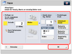 Sie können die Einstellungen für Zwischenblätter, Kapitelseiten oder Registerblätter bestätigen/ändern, indem Sie nach der Auswahl der Einstellungen die Taste [Details/Bearbeiten] berühren.