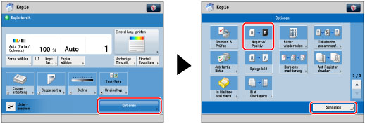 Berühren Sie nacheinander die Tasten [Optionen] → [Negativ/Positiv] → [Schließen].